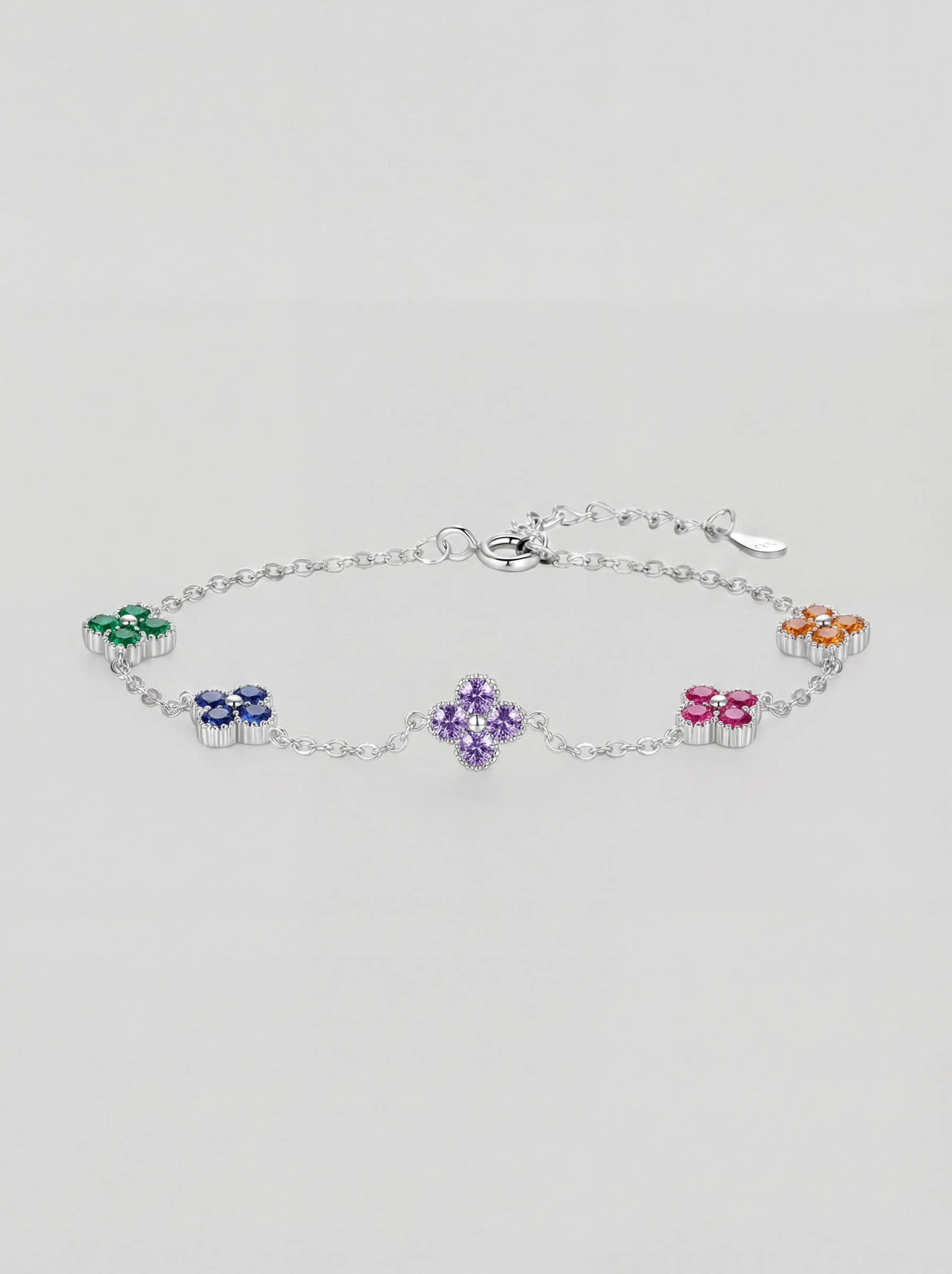 Five delicate clover motifs in emerald, sapphire, ruby, amethyst, and amber zirconia, linked by a fine 925 sterling silver chain. A playful touch of colour with refined detail.